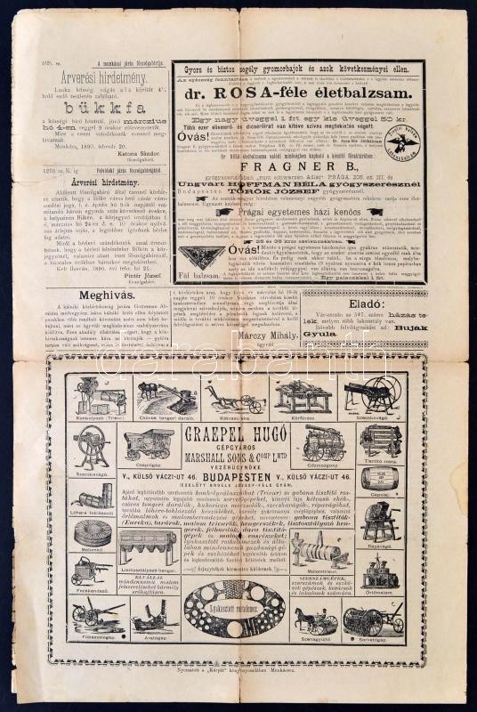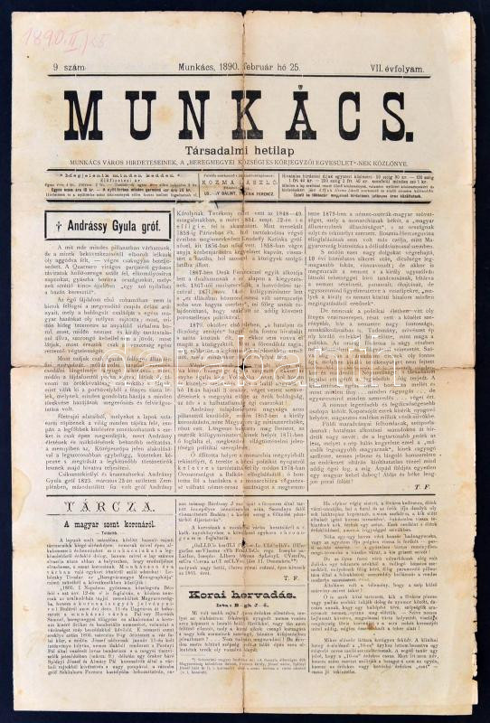 Leírás: 1890 Munkács, Társadalmi hetilap, hajtás mentén szakadásokkal, pp.:4, 50x33cm