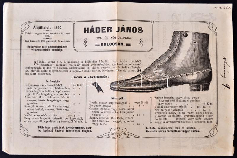 1905 Háder János kalocsai cipész fejléces számlája https://www.darabanth.com/hu/261-Gyorsarveres/261.0/Festmeny-mutargy-papirregiseg-egyeb/Nyomtatvanyok~29/1905-Hader-Janos-kalocsai-cipesz-fejleces-szamlaja~II1297938