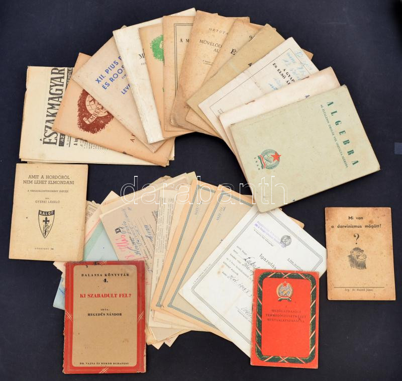 1945-1952 Vegyes nyomtatvány tétel: XII. Pius pápa és Roosevelt levelezése, Hogyan keletkezett az élet a Földön, A számok világa, Amit a hordóról nem lehet elmondani, Algebra, stb., 39 db
