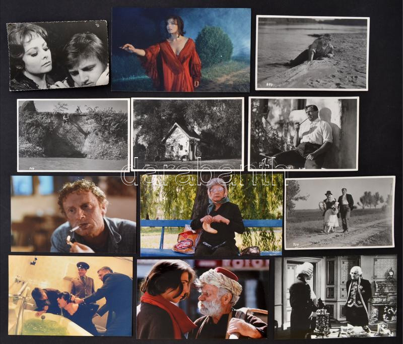 cca 1970-95 Vegyes filmfotók, fotólapok különböző színészekkel, köztük Tahi-Tóth László, Tolnai Klári, Daniel Olbrychski és még sokan mások, 12db, különböző méretben és minőségben, cca 18x13cm