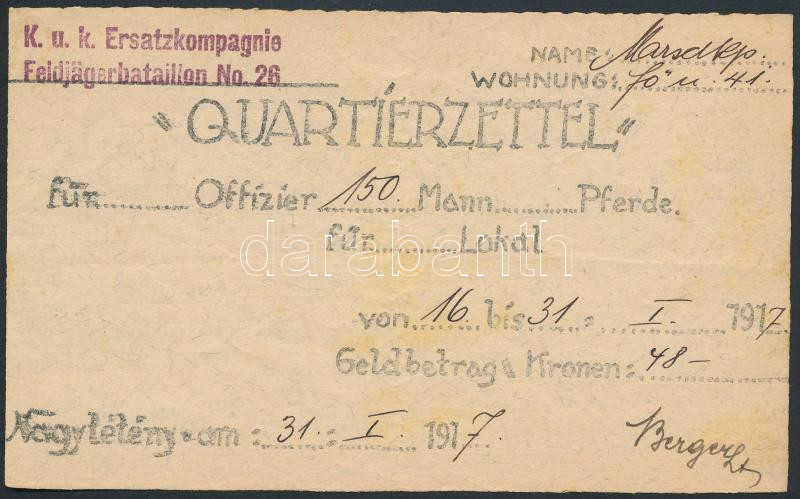 1917 "Quartierzettel" Szállásutalvány, K.u.K. Ersatzkompagnie, Nagytét... https://www.darabanth.com/hu/261-Gyorsarveres/261.0/Festmeny-mutargy-papirregiseg-egyeb/Okmanyok~15/1917-Quartierzettel-Szallasutalvany-KuK-Ersatzkompagnie-Nagyteteny-10x17cm~II1239243