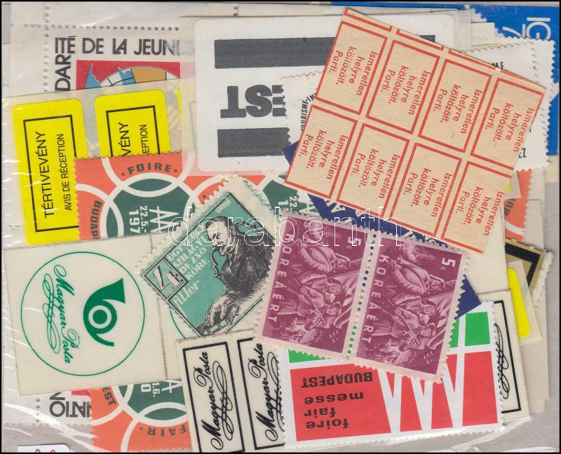 Leírás: 80 db ragjegy, levélzáró és propaganda bélyeg, javarészt magyar zacskóban ömlesztve