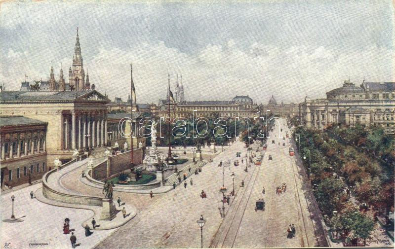 Leírás: Vienna, Wien I. Parlament with the flags of the Austrian Empire, Franzensring avenue, B.K.W.I. 433-6, s: R. Moser (worn edges)