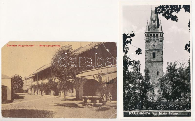 Nagybánya, Baia Mare; 2 db RÉGI képeslap, Bányaigazgatóság és a Szent István torony, vegyes minőség / 2 old postcards, mining directorate and the St. Stephen tower, mixed quality