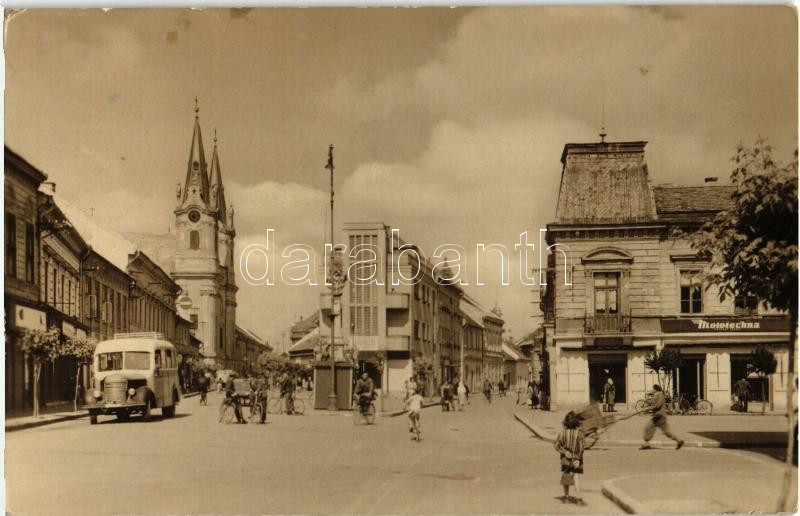 Leírás: Komárom, Komarno; Masaryk utca, Szent András-templom, Mototechna üzlet, autóbusz / street, church, shop, autobus