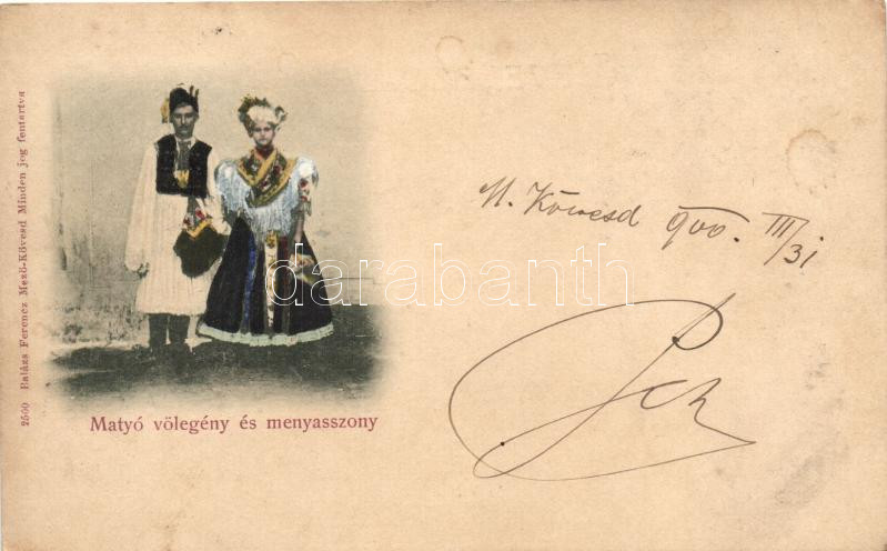 Matyó vőlegény és menyasszony / Hungarian matyó folklore https://www.darabanth.com/hu/261-Gyorsarveres/261.0/Kepeslapok/Folklor~400063/Matyo-volegeny-es-menyasszony-Hungarian-matyo-folklore~II1295017