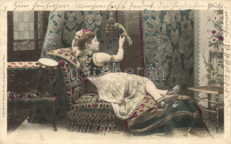 Leírás: Gently erotic lady with parrot in Middle Eastern setting (pinholes)