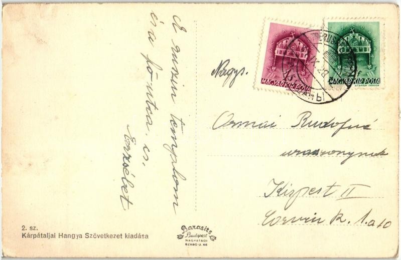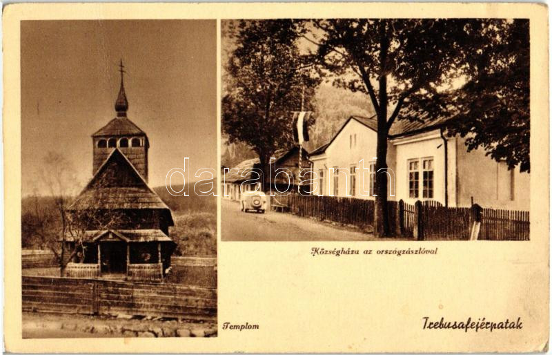 Trebusafejérpatak, Dilove; Templom, Községháza az országzászlóval, automobil, kétnyelvű bélyegzés a hátoldalon / church, town hall with national flag, automobile, bilingual cancellation on backside (fa)