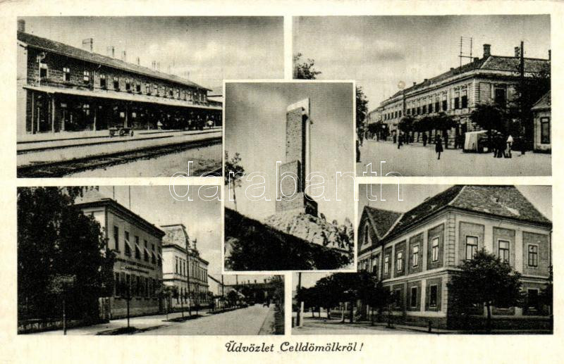 Leírás: Celldömölk, vasútállomás, Sághegyi Trianon kereszt, Járásbíróság, Községháza, kolostor
