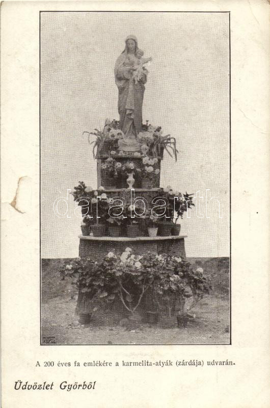 Győr, A 200 éves fa emlékére a karmelita atyák (zárdája) udvarán (b) https://www.darabanth.com/hu/261-Gyorsarveres/261.0/Kepeslapok/Magyarorszag~400006/Gyor-A-200-eves-fa-emlekere-a-karmelita-atyak-zardaja-udvaran-b~II1293053