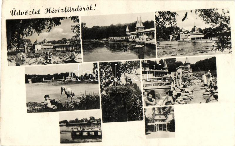 Leírás: Hévízfürdő, fürdőépület, gólya, fürdőzők