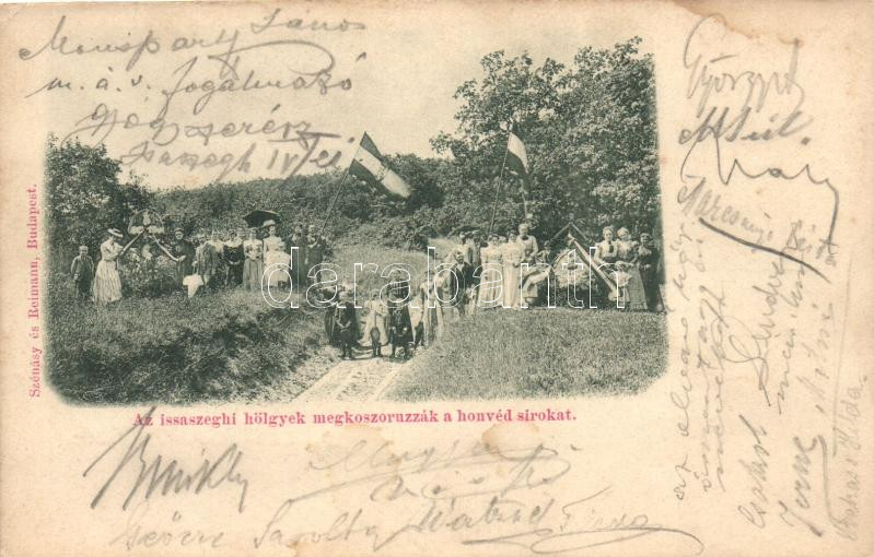 Leírás: Isaszeg, Az issaszeghi hölgyek megkoszoruzzák a honvéd sírokat, kiadja Szénássy és Reimann (fl)