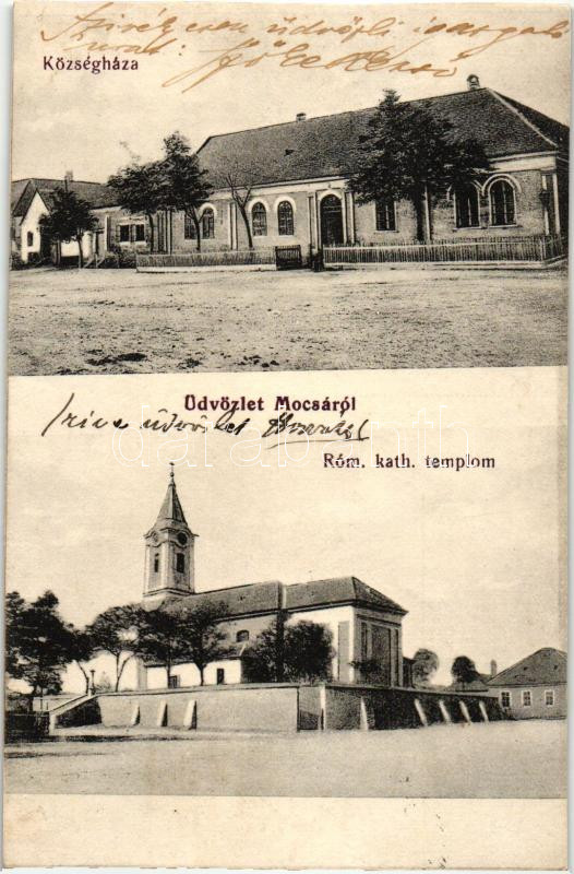 Leírás: Mocsa, Községháza, Római katolikus templom (vágott / cut)