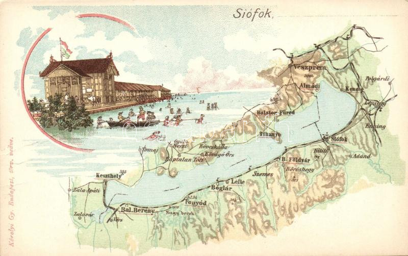 Leírás: Siófok, Balaton térkép, Károlyi Gy. litho (b)