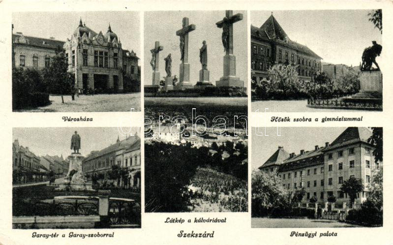 Szekszárd, Városháza, Kálvária, Hősök szobra a gimnáziummal, Pénzügyi palota, Garay tér a Garay-szoborral; kiadja Lugosi Béla könyv- és papírkereskedés (EK)
