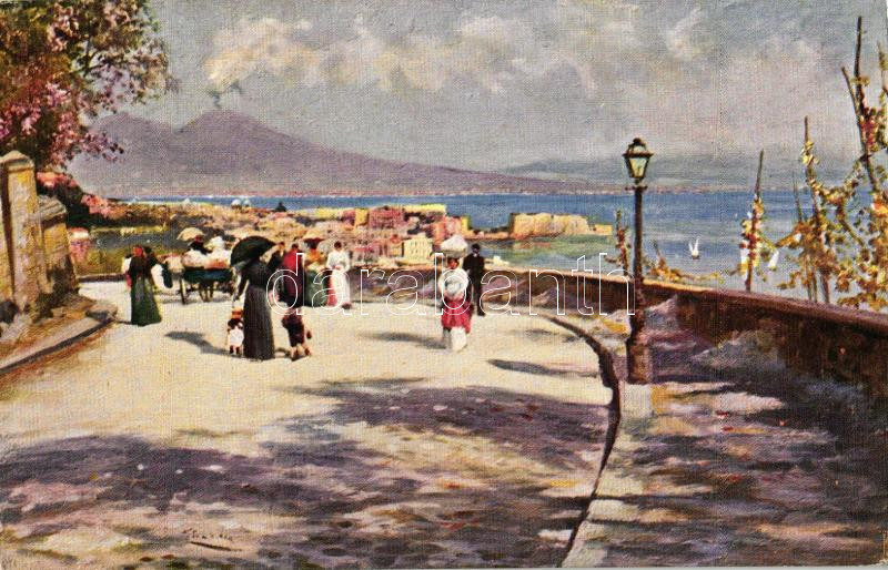 Leírás: Naples, Napoli; Via Tasso / street, art postcard, artist signed