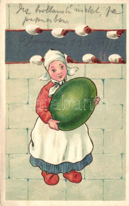 Leírás: Easter, girl in traditional dress with giant egg, Dutch folklore, litho, Emb. (fa)