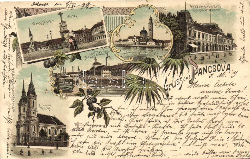 1898 Pancsova, Pancevo; Ferenc József tér, Görög ortodox templom, Temes folyó partja, J. M. Weiferr sörfőzdéje / square, church, river bank, brewery, floral litho (EB)