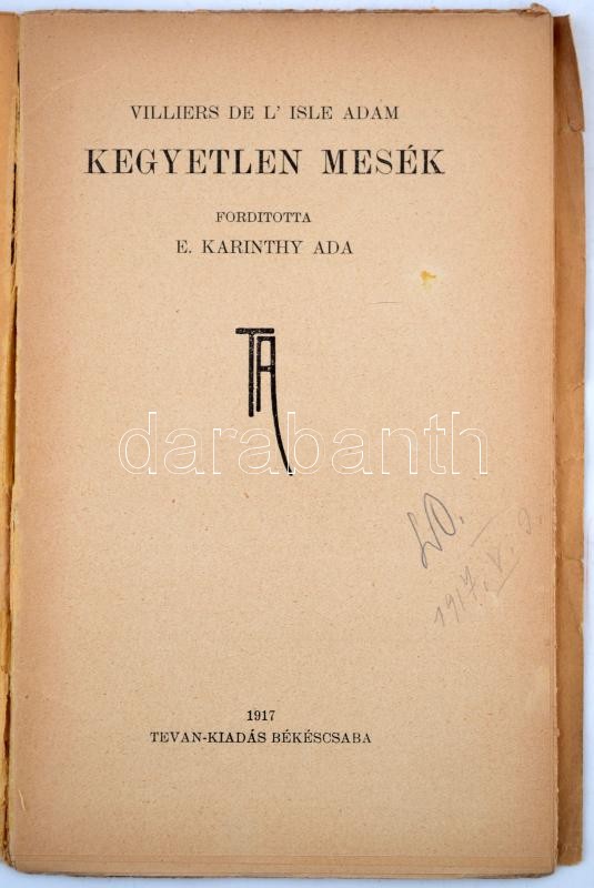 Adam Villiers de L'Isle: Kegyetlen mesék. Békéscsaba, 1917, Tevan... https://www.darabanth.com/hu/261-Gyorsarveres/261.0/Konyvek/Konyvek-Egyeb-ritkasagok~43/Adam-Villiers-de-LIsle-Kegyetlen-mesek-Bekescsaba-1917-Tevan-53-p-Kiadoi-rajzos-papirkC3~II1293118