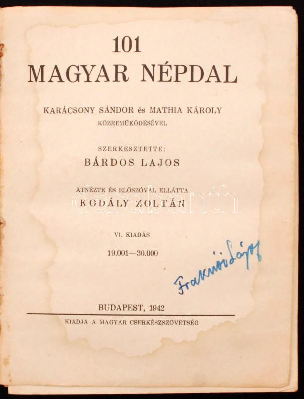 Bárdos Lajos(szerk.): 101 magyar népdal. Karácsony Sándor és Mathia Károly közreműködésével. Átnézte és előszóval ellátta Kodály Zoltán. VI. kiadás. Bp., 1942, Magyar Cserkészszövetség. Kiadói papírkötés, gerincnél levált, szétesett állapotban.