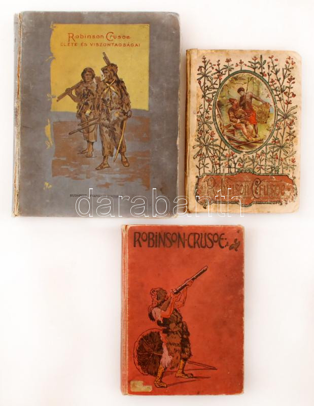Leírás: Daniel Defoe: Robinson Crusoe, 3 különböző kiadás: Bp., é. n., Franklin; Bp., 1905, Magyar Könyvkiadó Társaság; Bp. - Bécs, é. n., Deubler József. Példányonként változó, viseltes állapotban.