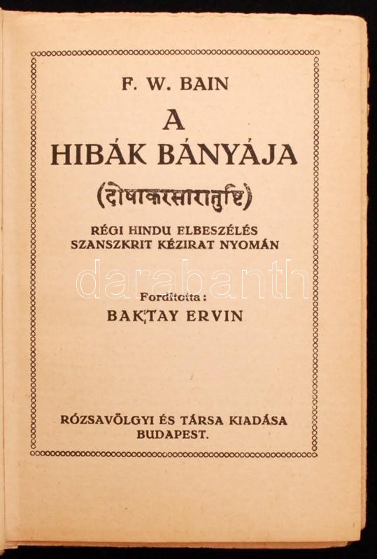 F.W.Bain: A hibák bányája. Régi hindu elbeszélés szanszkrit kézirat ny... https://www.darabanth.com/hu/261-Gyorsarveres/261.0/Konyvek/Konyvek-Egyeb-ritkasagok~43/FWBain-A-hibak-banyaja-Regi-hindu-elbeszeles-szanszkrit-kezirat-nyoman-Forditotta-Bak~II1292616