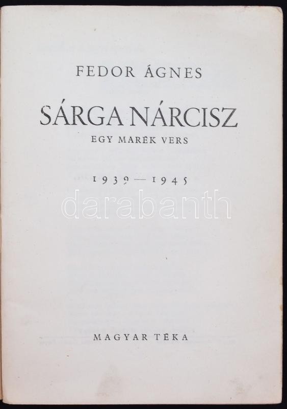 Fedor Ágnes: Sárga nárcisz. Egy marék vers. 1939-1945. Bp., 1945, Magyar Téka. 39 p. A címlap Gábor Éva munkája. Fűzve, illusztrált kiadói borítékban. Első kiadás.