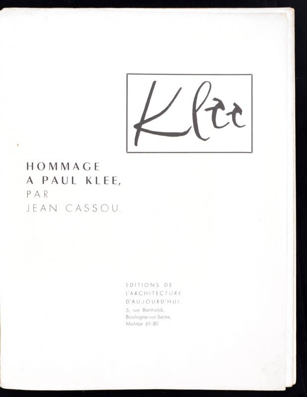 Hommage a Paul Klee par Jean Cassou. Boulogne-sur-Seine,1949, Ed. de l'Architecture d'Aujourd'hui. 12 fekete-fehér és 10 színes reprodukcióval. Kiadói papírkötésben. Linómetszetű borítóval.