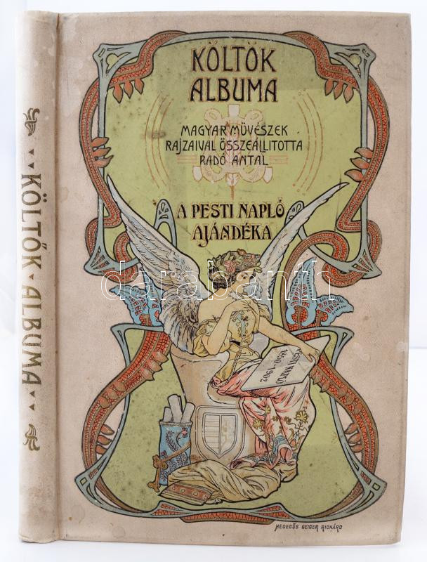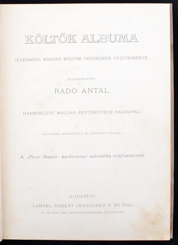 Költők albuma. Jelenkori magyar költők verseiből. Összeállította: Radó Antal. Negyedik, módosított és bővített kiadás. Harminczöt magyar festőművész képeivel. A Pesti Napló karácsonyi ajándéka előfizetőinek. Bp., é.n. Lampel R. 284 p. Aranyozott, dombornyomott, festett kiadói egészvászon-kötésben.