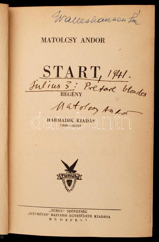 Leírás: Matolcsy Andor: Start. Bp., é.n., Turul Szövetség Szépmíves Bajtársi Egyesület. Kiadói aranyozott vászonkötésben. Dedikált példány!