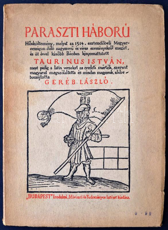 Leírás: Taurinus István: Paraszti háború. Hősköltemény Dózsa György harcáról, tetteiről haláláról. Írta 1514-1519-ben - - gyulafehérvári vikárius. Latin eredetiből fordította napjainkban Geréb László. Egykorú fametszetekkel. Budapest, é.n., Budapest Székesfőváros házinyomdája. Kiadói papír kötésben.