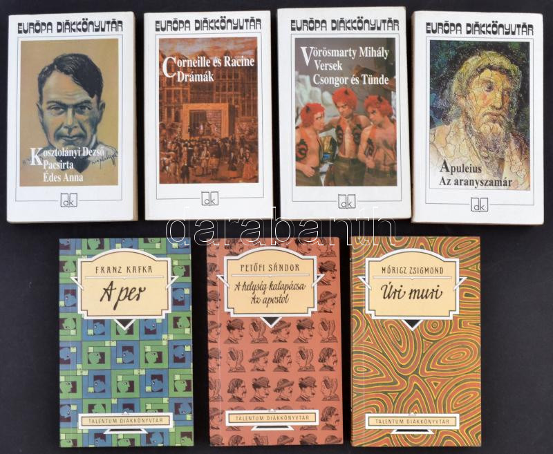 Vegyes kötelező olvasmány tétel a Talentum illetve az Európa Diákkönyvtár sorozatok kötetei, iskolakezdésre időszerű: Móricz, Vörösmarty, Kosztolányi, Petőfi, Kafka, Corneille, Racine, Apuleius, jó állapotban