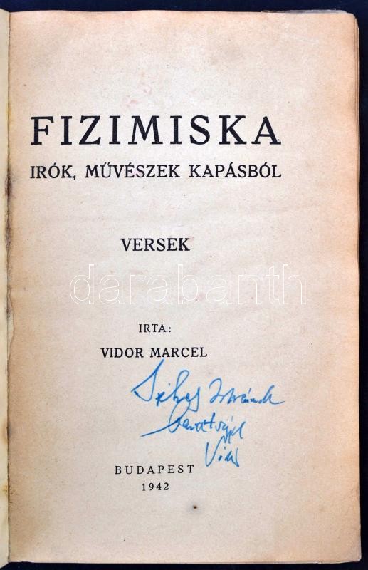 Leírás: Vidor Marcel: Fizimiska. Írók, művészek kapásból. -Versek. Bp., 1942, szerzői kiadás. 48 p. Kiadói, illusztrált papírborítékban. A kötet erősen átázott, a lapok hullámosak, foltosak, a papírborítók sérültek. Dedikált példány!
