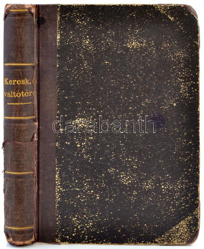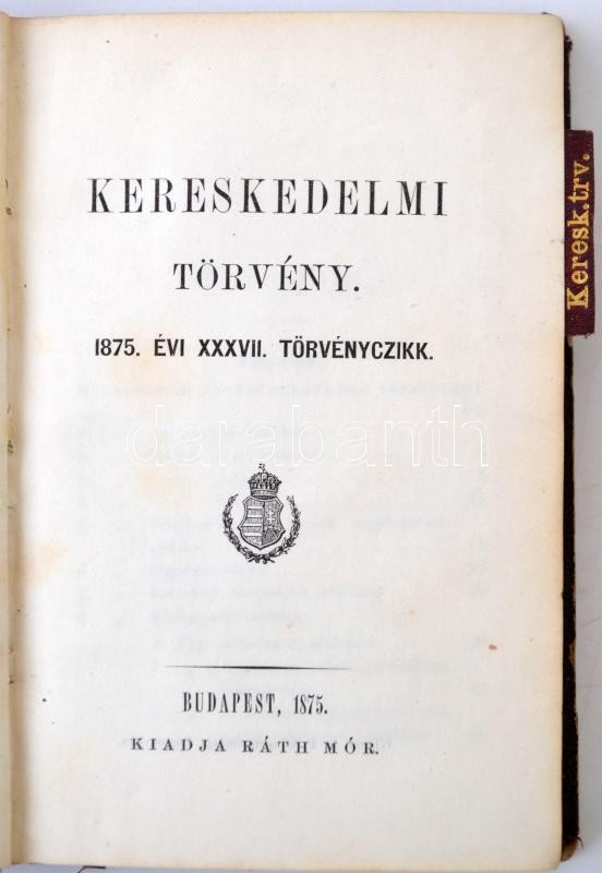 A kereskedelmi törvény. 1875. évi XXXVII törvénycikk. 240 p. Hozzákötve: A kereskedelmi törvény életbeléptetésére vonatkozó ministeri szabályrendeletek. 56 p.; valamint 1876-iki váltó-törvény. 62p. Bp., 1875-76, Ráth Mór. Korabeli kopottas-sérült félvászonkötésben, két lap kis részben hiányos.