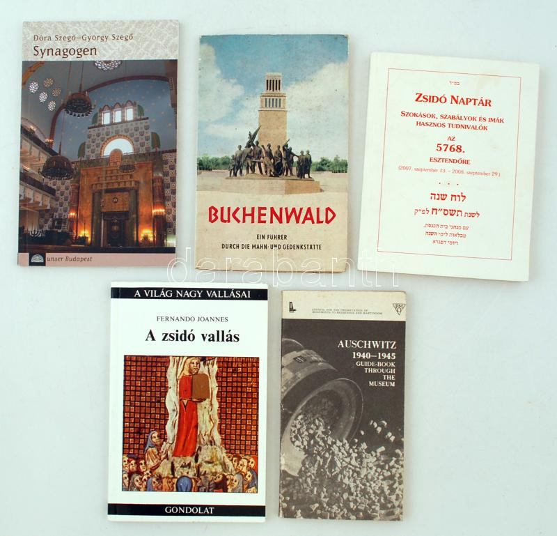 5 db könyv-Auschwitz 1940-1945. Guide-book through the museum; Buchenwald. Ein Führer urch die Mahn- und Gedenkstätte; Zsidó naptár. Szokások, szabályok és imák, hasznos tudnivalók; Fernando Joannes: A zsidó vallás; Dóra Szegő-György Szegő: Synagogen. Kiadói papírkötés, kötetenként változó állapotban,