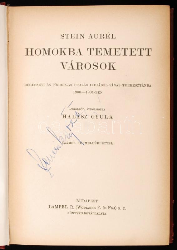 Stein Aurél: Homokba temetett városok. Bp., é. n., Lampel R. (A Magyar Földrajzi Társaság Könyvtára). Kicsit kopott, díszes, aranyozott vászonkötésben, egyébként jó állapotban.