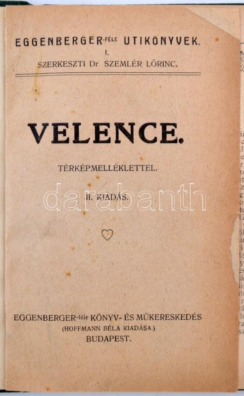 Leírás: Velence. Térképmelléklettel és képekkel. Eggenberger-féle útikönyvek. Szerk.: Szemlér Lőrinc. Bp., 1912. Eggenberger. 69 p. Korabeli egészvászon-kötésben.