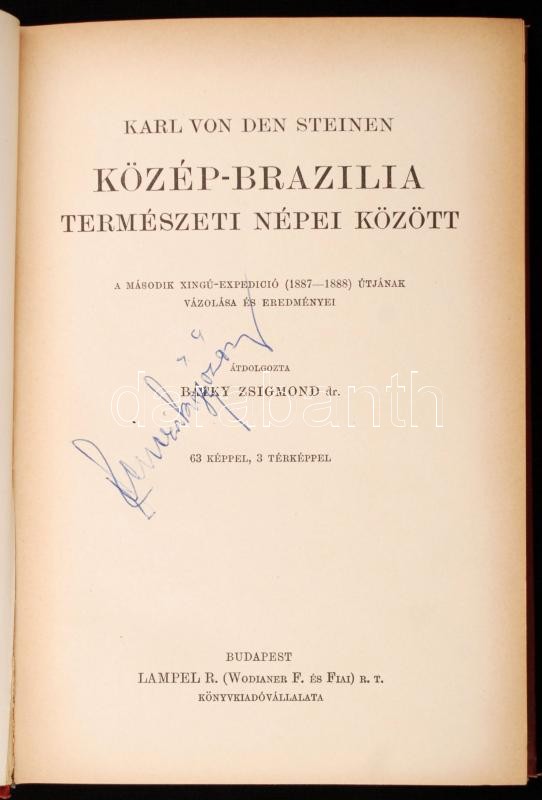 Von den Steinen, Karl: Közép-Brazília természeti népei között. Bp., é. n., Lampel R. (A Magyar Földrajzi Társaság Könyvtára). Kicsit kopott, díszes, aranyozott vászonkötésben, egyébként jó állapotban.