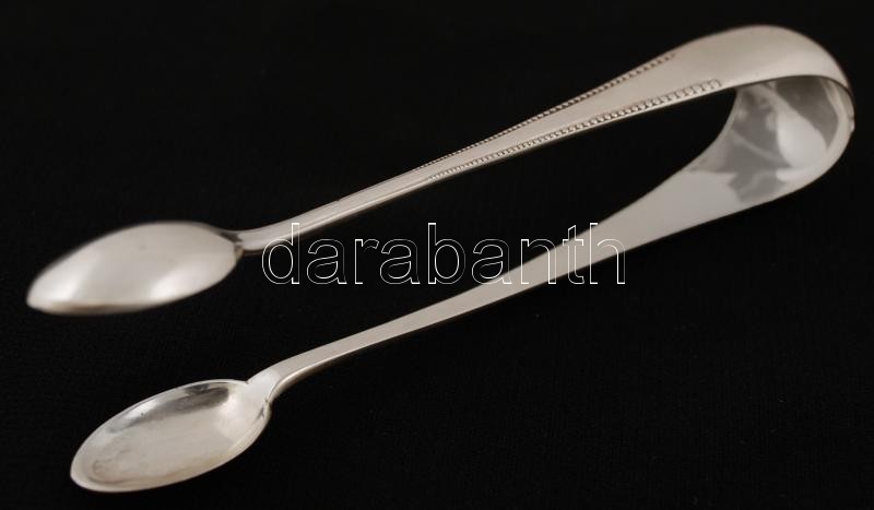 Leírás: Ezüst kávéskanál, 6db (ebből 1db monogramos) + cukorcsipesz, Ag., nettó: 124,5gr, jelzett /Silver teaspoon, 6 (including monogrammed 1pc) + sugar tongs, Ag, net. 124,5gr, marked
