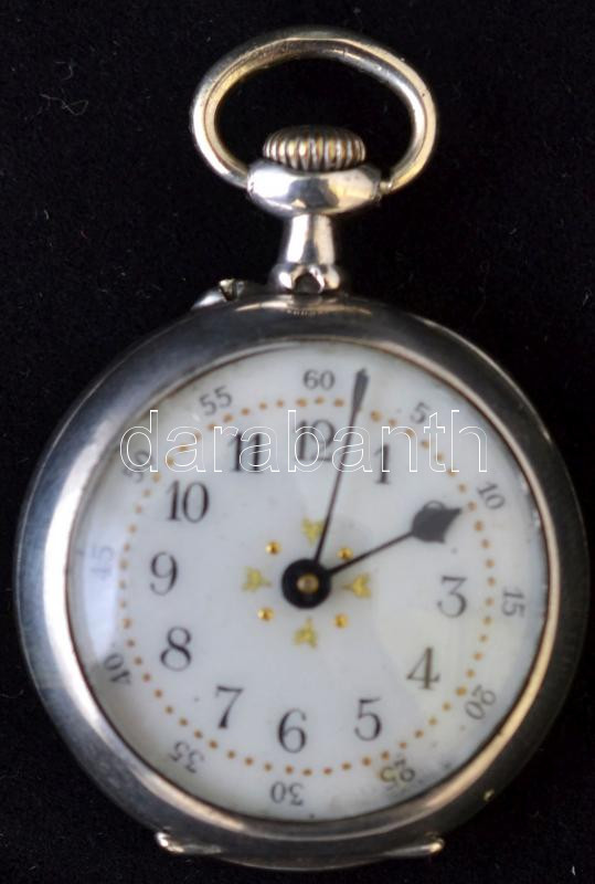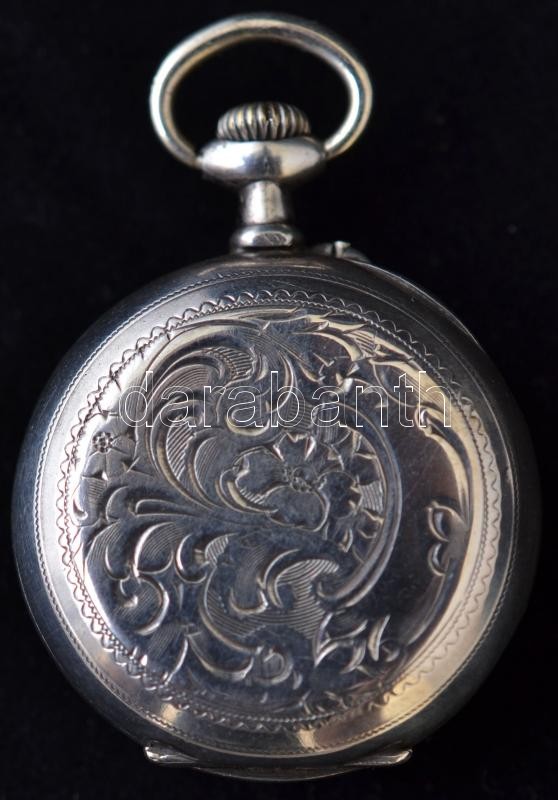 Ezüst zsebóra, Ag., bruttó:23,3gr., jelzés nélkül, működik, d:3cm /Silver pocket watch, Ag., gross: 23,3 gr, without hallmark, it works, d: cca 3 cm
