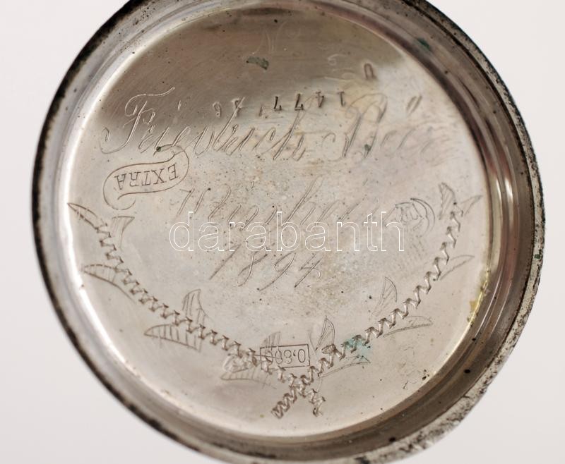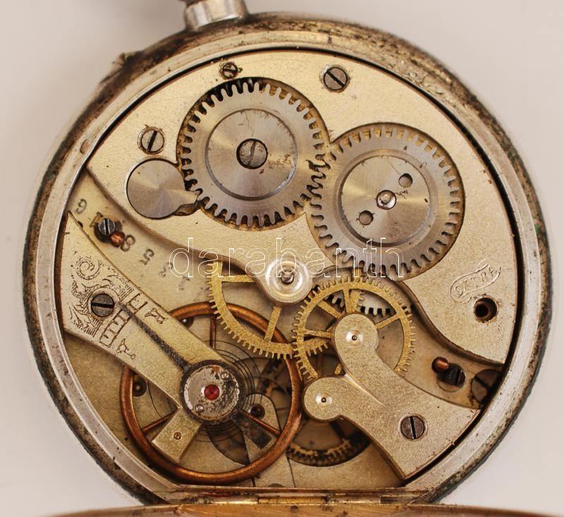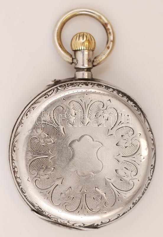 Ezüst zsebóra, Ag.,bruttó:76,1gr., jelzett, nem működik, üveg nélkül, d:4,5cm/Silver pocket watch, Ag, gross:.. 76,1gr, marked, does not work,without lens d: 4,5cm