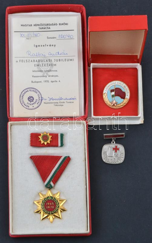 Leírás: 1970. "Felszabadulási Jubileumi Emlékérem" aranyozott, zománcozott Br kitüntetés mellszalagon, eredeti tokban, igazolvánnyal + "A könnyűipar kiváló dolgozója" zománcozott fém jelvény tokban (31mm) + "15. Véradásért" fém jelvény T:2