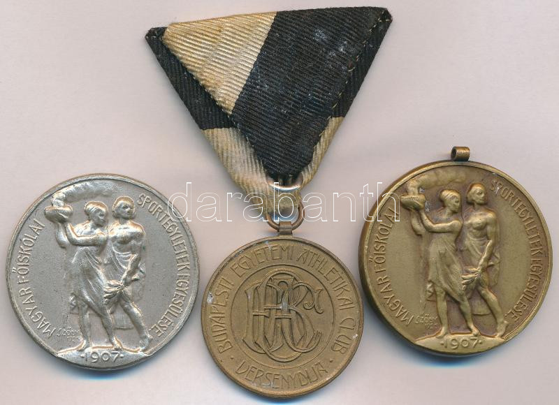 Leírás: Sződy Szilárd (1878-1939) 1936-1938. "Magyar Főiskolai Sportegyletek Egyesülése - 1907" Br és ezüstözött Br díjérem szalag nélkül (40mm) + ~1920. "Budapesti Egyetemi Athletikai Club versenydíja / Virtvti et fortitvdini" Br díjérem mellszalaggal (33mm) T:2