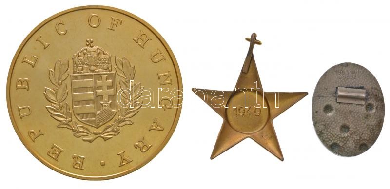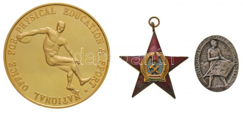 Vegyes: 1949. "A Magyar Népköztársasági Érdemérem arany fokozata" zománcozott aranyozott bronz kitüntetés mellszalag nélkül + DN "National Office of Physical Education & Sport (Nemzeti Testnevelési és Sport Iroda)" aranyozott piefort fém emlékérem (65mm) + Svájc 1929. "Augusztus 1. 1929" fém jelvény. Szign.: Franz Wanger (35x27mm) T:2-,PP,2 karc,ujjlenyomat, jelvényről tű hiányzik, érdemérem egyik szára zománchiányos