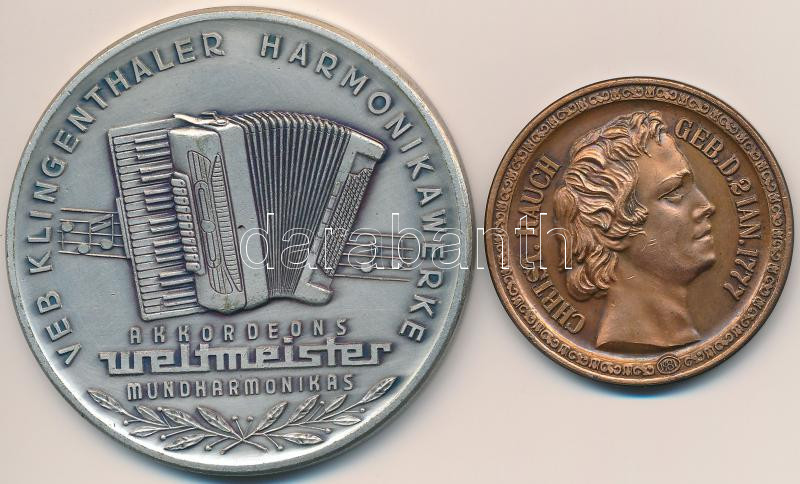 Leírás: NSZK 1981. "Christian Rauch született 1777. jan. 2." Br emlékérem (40mm) + NDK DN "VEB Klingenthaler Harmonikawerke" ezüstözött fém emlékérem (60mm) T:2