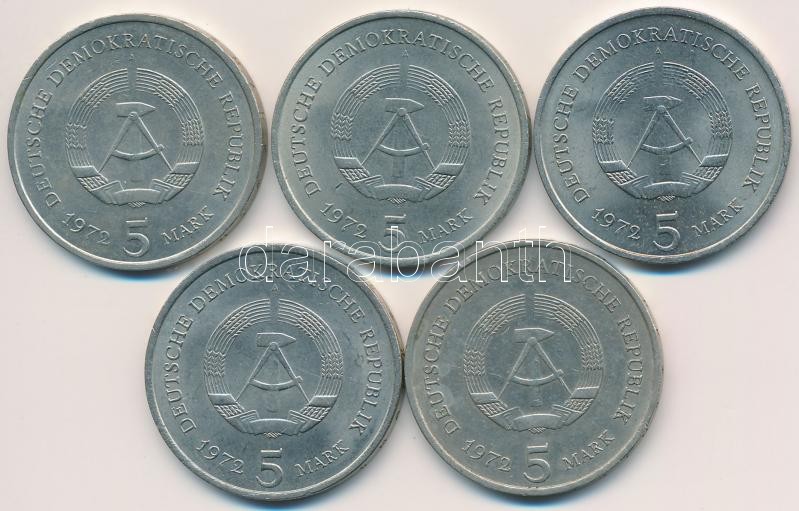 GDR 1972. 5 Mark "Meiße... https://www.darabanth.com/hu/261-Gyorsarveres/261.0/Numizmatika/Kulfoldi-fem-es-ezustpenzek~300013/NDK-1972-5M-MeiC39Fen-5x-T2--GDR-1972-5-Mark-MeiC39Fen-5x-CXF~II1273660