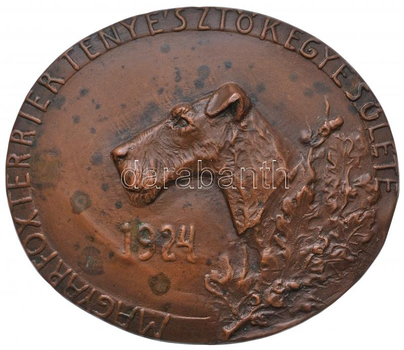 Leírás: 1924. "Magyar Foxterrier Tenyésztők Egyesülete" bronzozott fém plakett (78-91,5mm) T:2 foltos