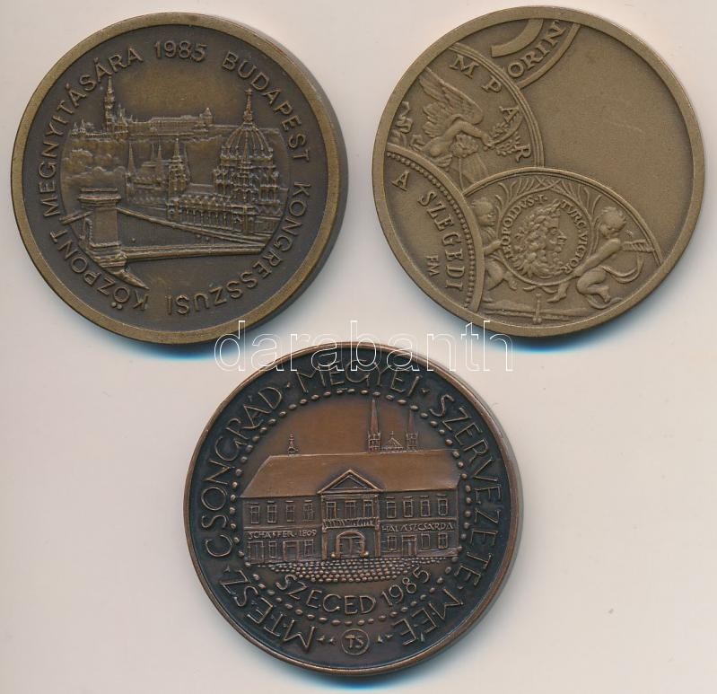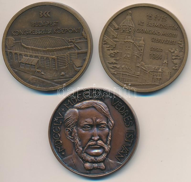 Fritz Mihály (1947-) 1984. "15 éves a MÉE Csongrád Megyei Szervezete Szeged" Br emlékérem (42,5mm) + Tóth Sándor (1933-) 1985. "MÉE Szeged / Vedres István" Br emlékérem (42,5mm) + 1985. "Budapest Kongresszusi Központ megnyitására" Br emlékérem (42,5mm) T:1-,2