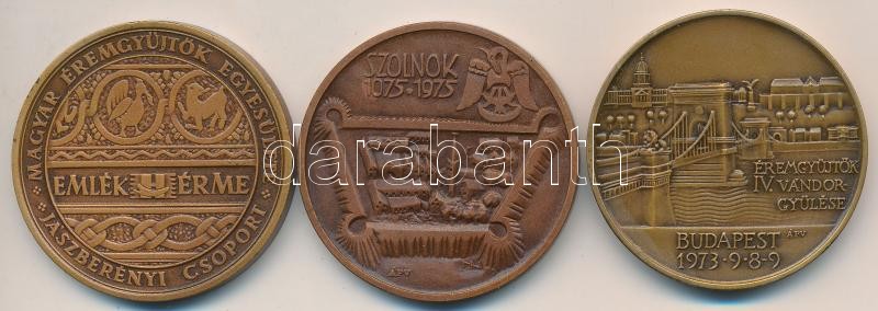 Leírás: Lisztes István (1942-) 1973. "MÉE - Jászberényi Csoport / Pest-Buda-Óbuda egyesítésének századik évfordulójára" Br emlékérem (42,5mm) + Nagy István (1920-) 1975. "Magyar Éremgyűjtők VI. Vándorgyűlése Szolnok / Szolnok 1075-1975" Br emlékérem (42,5mm) + Asszonyi Tamás (1942-) 1973. "Éremgyűjtők IV. Vándorgyűlése / Pest-Buda-Óbuda egyesítésének centenáriumi évében" Br emlékérem (42,5mm) T:1-,2
