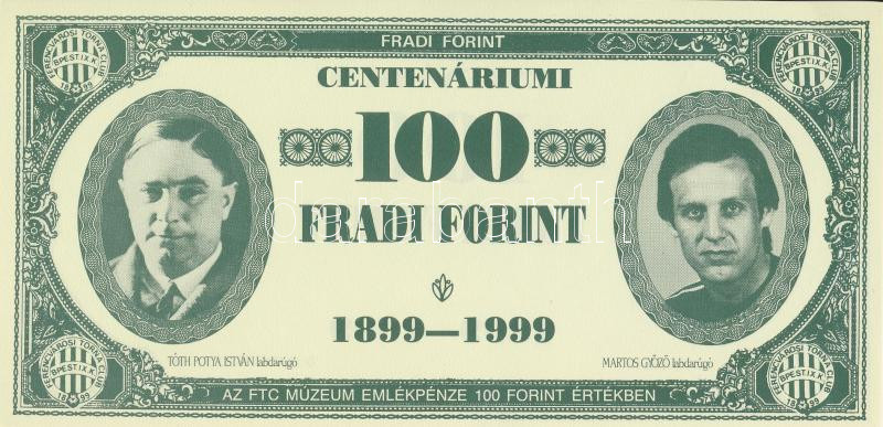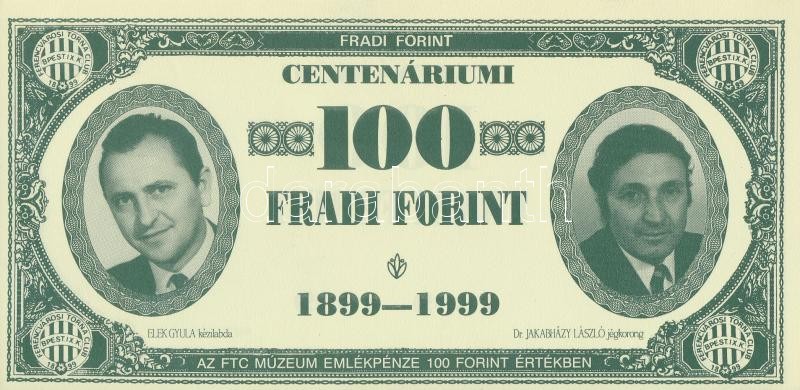 Leírás: 1999. 100Ft névértékű " Centenáriumi Fradi Forint" Elek, Dr. Jakabházy, Tóth Potya, Martos fényképével T:I,I-
